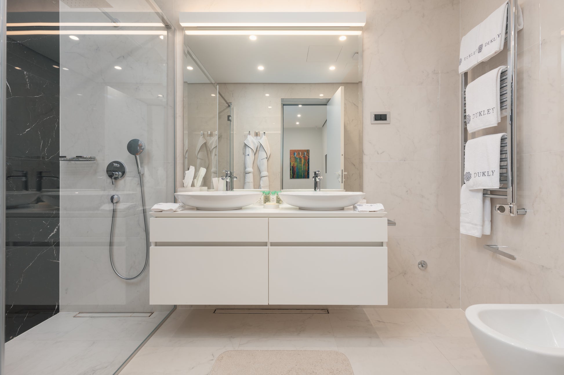 The Dukley Gardens complex offers parking, laundry service, salon, marina, private beaches, beach bar, swimming pool, restaurant, a kindergarten and a school. This exclusive complex can be entered by key card only, ensuring complete privacy and safety. The buildings in this complex are built with only high-quality materials from reputable and renowned brands. The walls of the villas are lined with rare white stone from the company Jadran Kamen, the fittings and door locks were provided by Gretsch-Unitas,a German company. The windows and doors are aluminium structures using Sunguard architectural glass from Guardian and the tiles were made using modern technologies from the Italian company Florim.