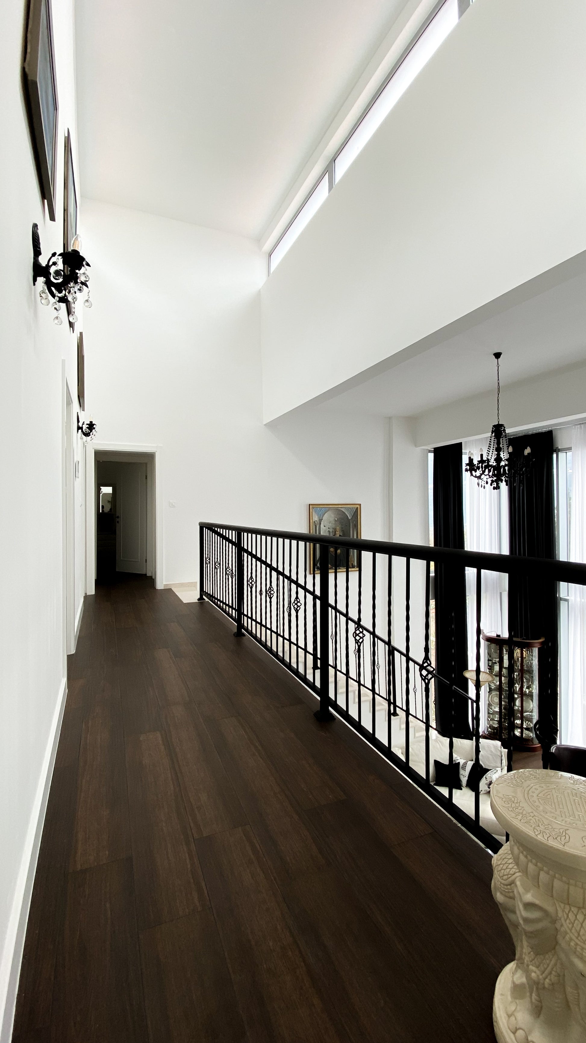 A grand open-plan living area with towering ceilings seamlessly connects to the kitchen and dining space. This level also includes one bedroom, an office, two bathrooms, a laundry room, a storage room, and an enclosed terrace.
